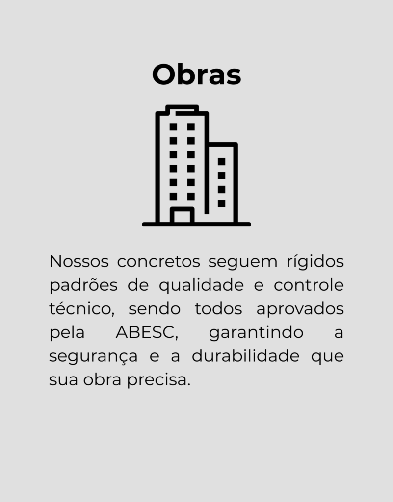 Nosso compromisso vai além do concreto: entregamos confiança e segurança. Garantimos atendimento ágil com entrega em até 24 horas, utilizando frota própria e equipe qualificada, sempre preparados para suprir as necessidades da sua obra com precisão e eficiência.